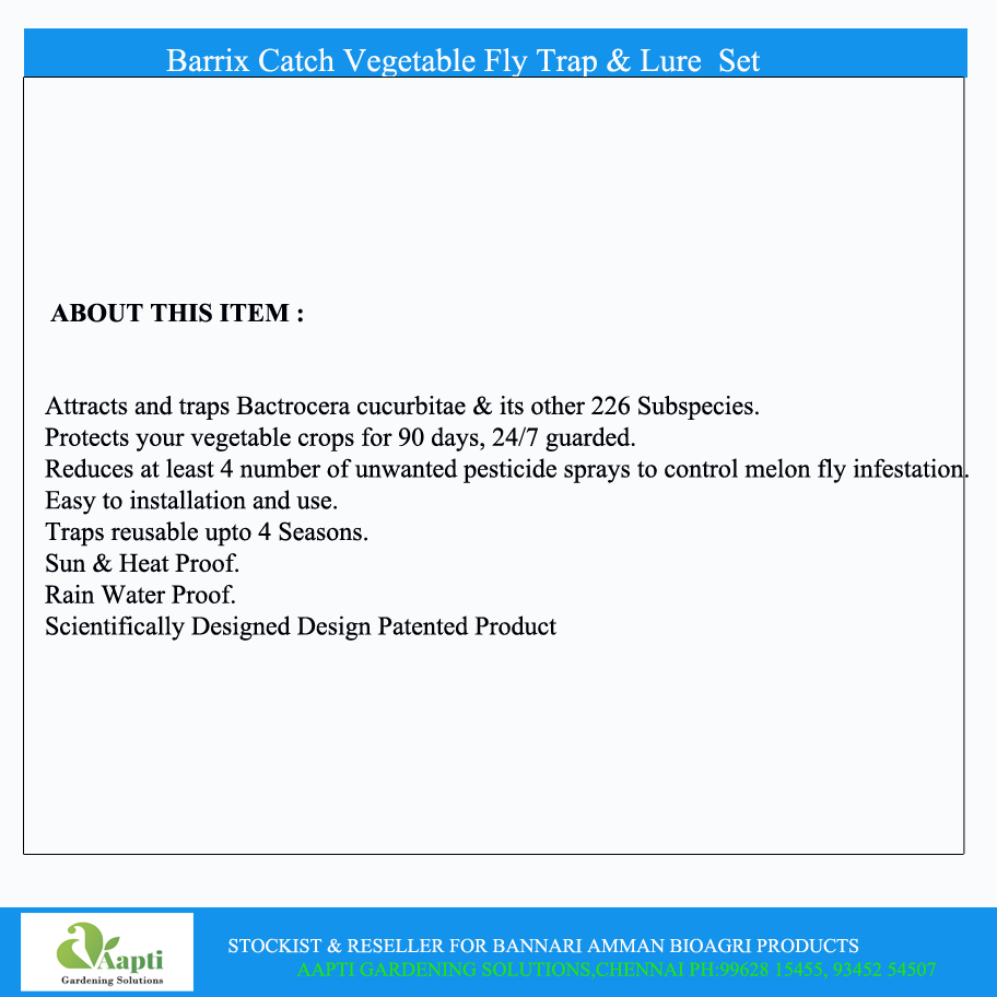 - For prolonged harvest replace the Barrix Catch Vegetable fly Lure piece once for every 90 days.