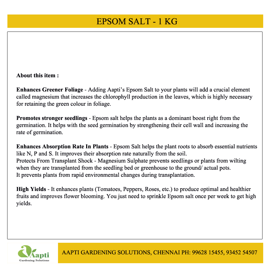 When diluted with water, Epsom salt is easily taken up by plants, especially when applied as a foliar spray. Most plants can be misted with a solution of 2 tablespoons (30 mL) of Epsom salt per 2 ltrs of water.